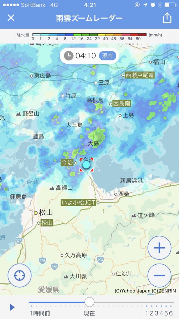 雨雲マップを見たら今治上空だけ雨雲がかかっている感じで運が悪く雲の通り道にいるっぽい。