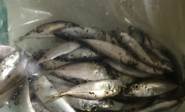 その後潮の流れが変わりしばらく釣れなかったがまた群れが回ってきたのか入れ掛かりになってきて豆サバ混じりで30匹ほどゲット。