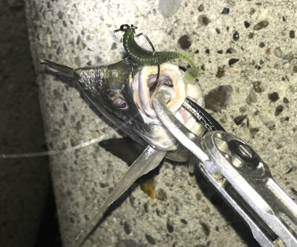 これは確実にバチパターンシーバスが釣れると感じ、前回同様直リグ2.5グラムと軽めの重りにガルプサンドワーム2インチをオフセットフックに取り付けて投げる。