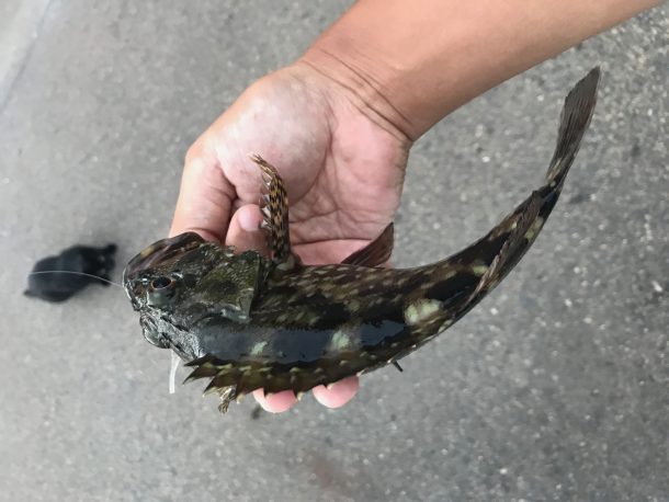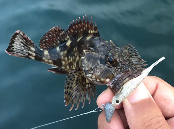 しかし、クーラーボックスを持ってきた途端サイズがリリースサイズしか釣れなくなる・・・。底にはガシラがいるが表層にはムラソイがいるみたいで着水と同時にヒットする。