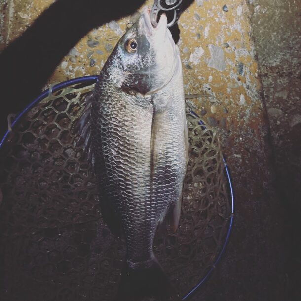 辛いが頑張って投げていると投げて着底させた瞬間小さなアタリ。瞬時に合わせるとうまくヒット。そこそこナイスファイトでドラグも出してくれたのが40センチあるかどうかサイズのキビレでした。