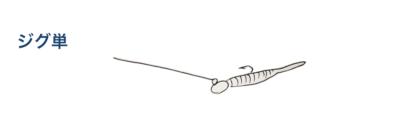 ジグヘッド単体で使うのがジグ単と呼ばれる仕掛け。