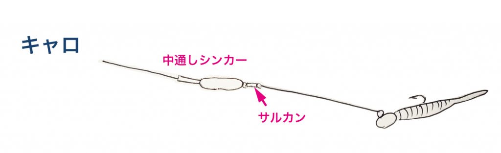 キャロライナリグともいうこの仕掛けは中通しタイプの重りを使い、サルカンにリーダーを付けたジグヘッドを結んで使用する。