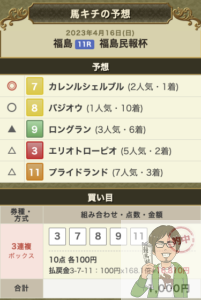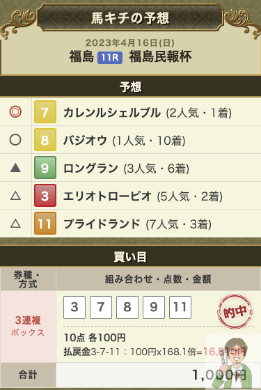 ちなみに、日曜日の福島日報杯は本命が2番人気のカレンルシェルブルで1着に入り、単勝410円はガッツリゲットできたものの3連複は1番人気のバジオウを入れたばかりに外している。このレースの三連複は16810円の高配当だったのに…。