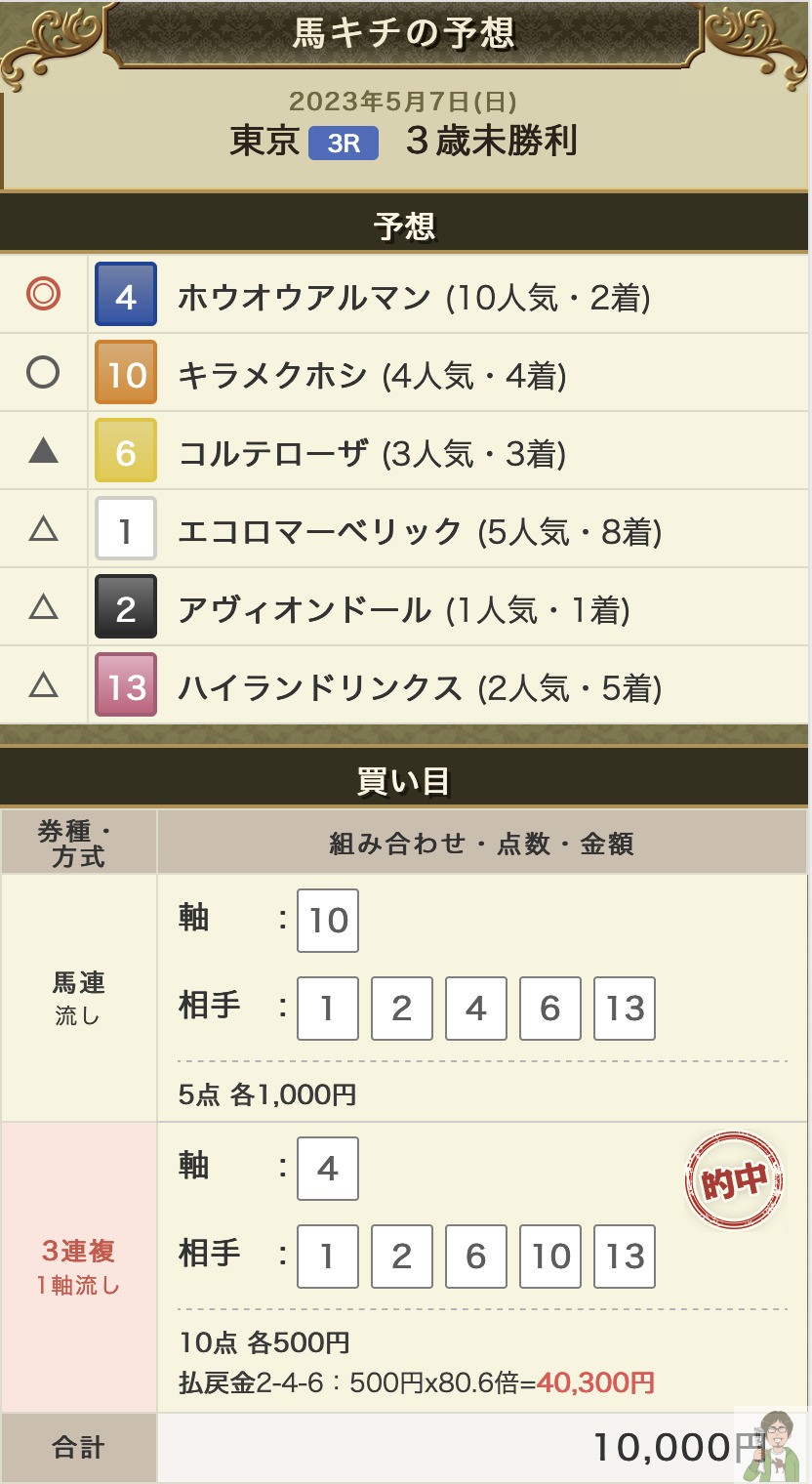 カラテの1着は信じていたし、3着の12番人気イクスプロージョンもワイドで抑えている通り、今回狙いの1頭だった。
