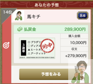 この的中もあって7段で週間ランキング4位になり、5ポイントゲットで8段に返り咲きです。
