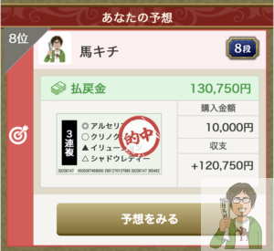 実馬券は午後から買い始めてちょいちょい当たって割りと回復したものの土曜日のマイナスを全回復することなくメインへ、メインレースは巴賞を当てて全回復!3連複ギリギリハナ差で当たったけど1,2着は完全に予想できていただけに三連単で良かったやん…という結果だった。