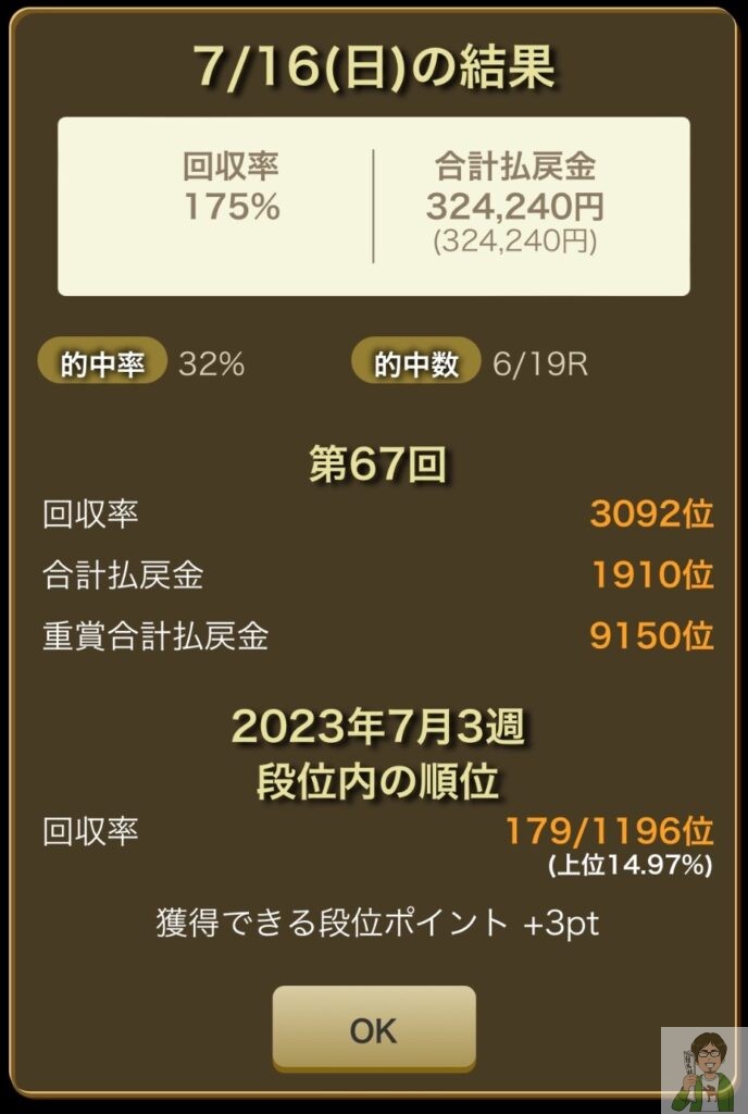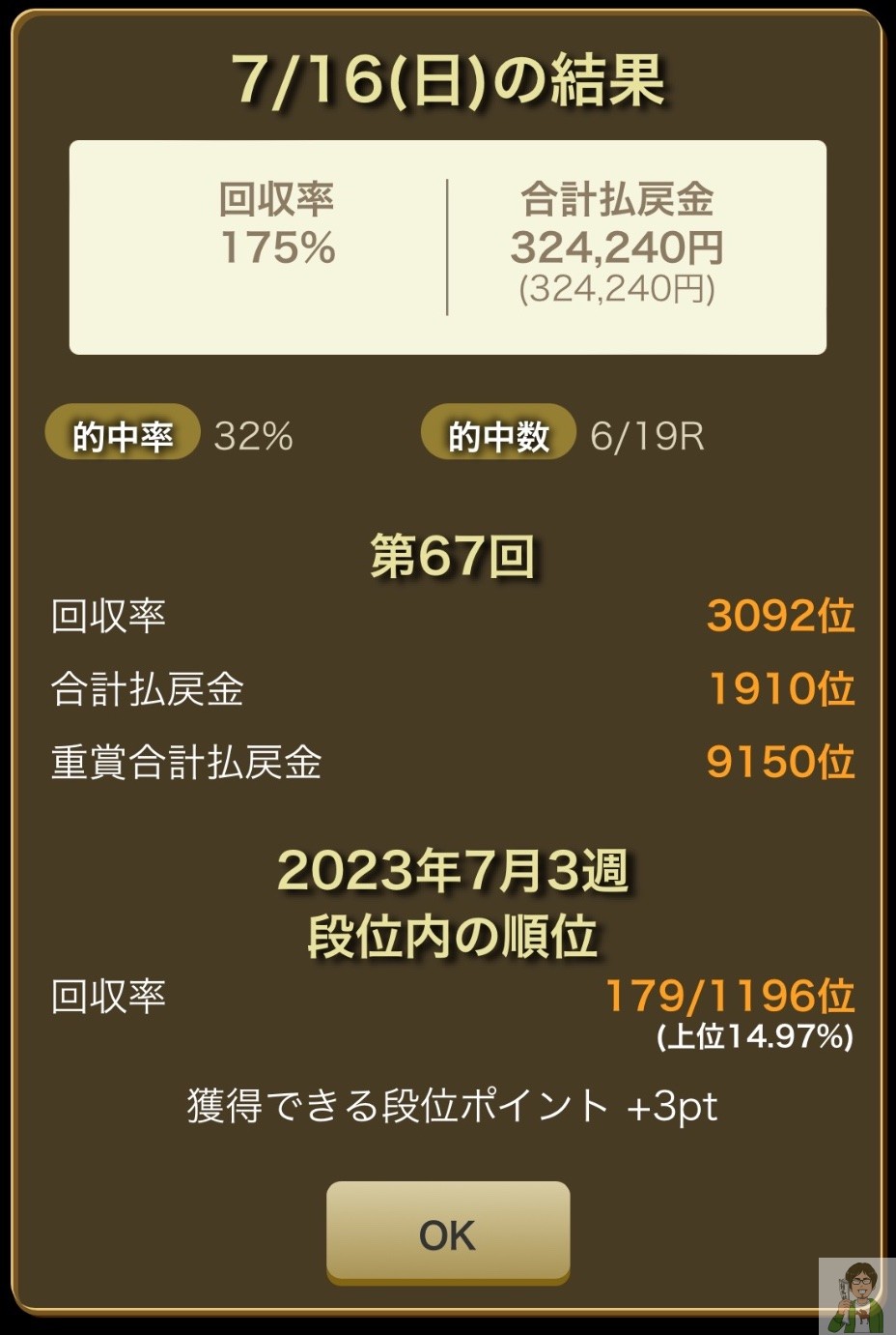 2週間前ぐらいにも土曜日の段階で2ポイントゲット出来たのに日曜日さらなるポイントゲットを狙って撃沈してなかったらもっと早く上がれたんだけどまぁ夏競馬開催中に馬士を狙うという目標へ一歩近づけたのでオッケー。秋は馬士以上で迎えたい。