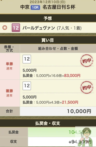 そんな好走確率の高い馬が前走の着順と大外枠と大幅プラス体重によって7番人気で単勝16.6倍・複勝4.3倍と明らかに過剰不人気になっているのが見えたので単複でプラスに出来ると判断して勝負しました。結果は予想外の逃げの手に出ましたが大幅距離短縮の効果もあってかしぶとく逃げ粘って逃げ切り勝ち。