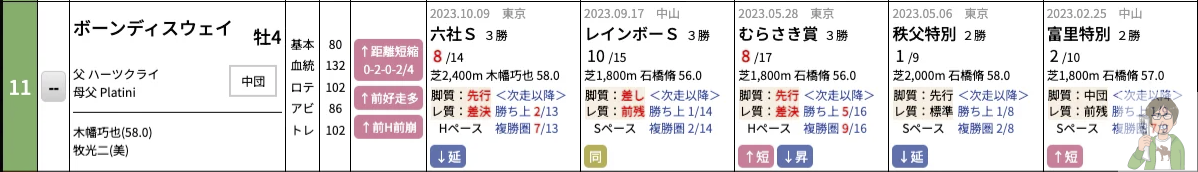なぜこのレースでボーンディスウェイが勝てると予想したのか?というとまず、ポイントの部分が3つともプラスの意味で示されるピンクになっていた点。