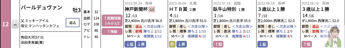 このレースで狙ったバールデュヴァンは前走が神戸新聞杯というG2のレースからの降級で、3段階の大幅降級というのも非常に大きな魅力だったのですが負けた理由も赤字の部分でレース展開が合わなかったのが大きな理由というのがわかります。更にその前は次走以降で複勝圏に4頭が入るレースの4着と2勝クラスでも問題なくやれる力があることがわかります。