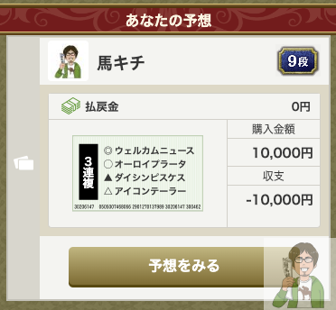 馬券的にはボッコボコになって残り500円でメインレースを迎え、本命のウェルカムニュースから4頭に馬連で100円ずつと単勝で買った結果、ウェルカムニュースが2着に来て、3番手予想のダイシンピスケスが勝ったので馬連5700円ゲットでした。予算全回復で土曜日の競馬が終われたので大勝利の気分です(笑)