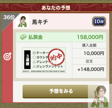 毎週重賞を予想するコーナーです。基本的に本命、対抗、三番手、穴を予想して本命から馬連とワイドで勝負しています。少点数で競馬を楽しみたい方におすすめの予想コーナーとなっております。当たるか当たらないかはその時々の調子によりますが2022年の上半期は桜花賞が選んだ3頭で決まったり、ダービーが本命、対抗、穴で決まったりと信じがたい好調っぷりでした。下半期は反動がヤバそうです。