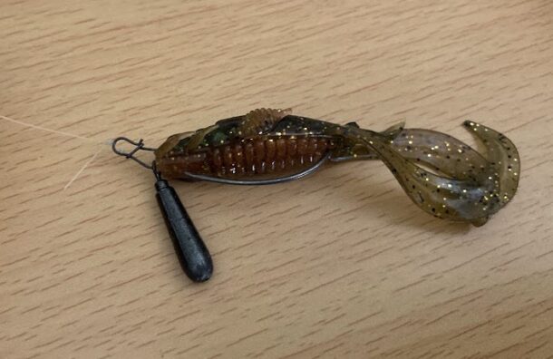 チニング大会で優勝ルアーとなったのがこのワーム。チヌの大好物エビやシャコにそっくりで食いやすいシルエットなのも釣れる理由か。