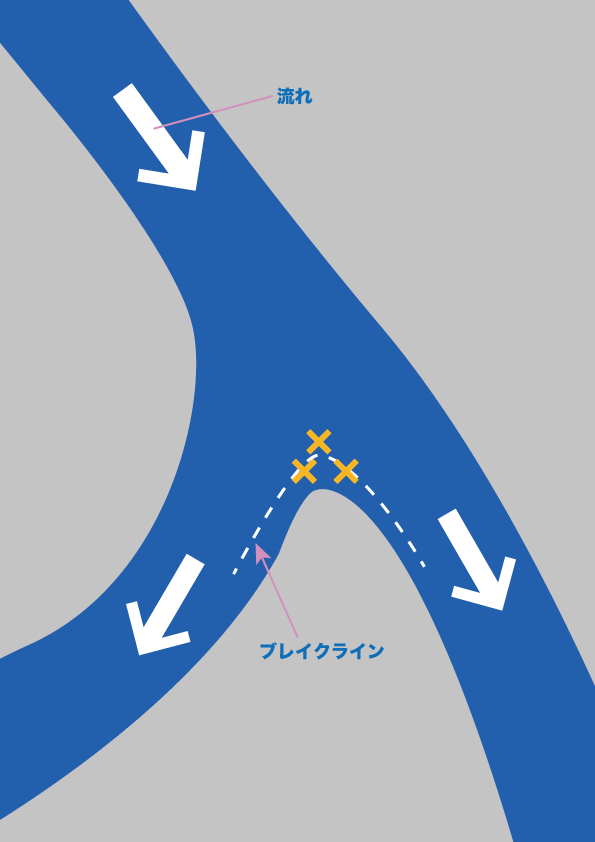 上の図のような川が2つに分かれる分岐点では流れが当たる時間帯に分岐の頂点を攻めるのがよい。