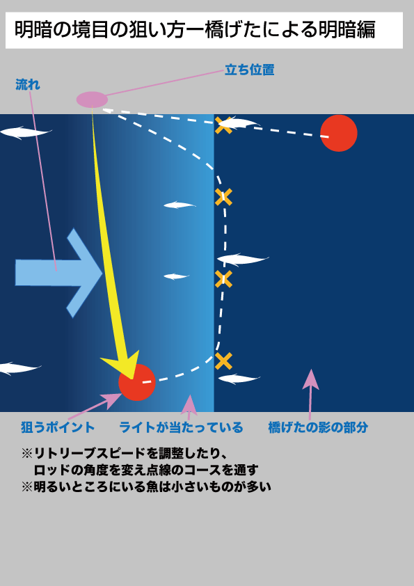ナイターゲームでのシーバス釣りで基本となるのが明暗部分の釣り。小魚は明るい部分へ集まるのでそれを食べにシーバスも明かりに集合する。そのシーバスをどう狙うかを図にしたので参考にして欲しい。