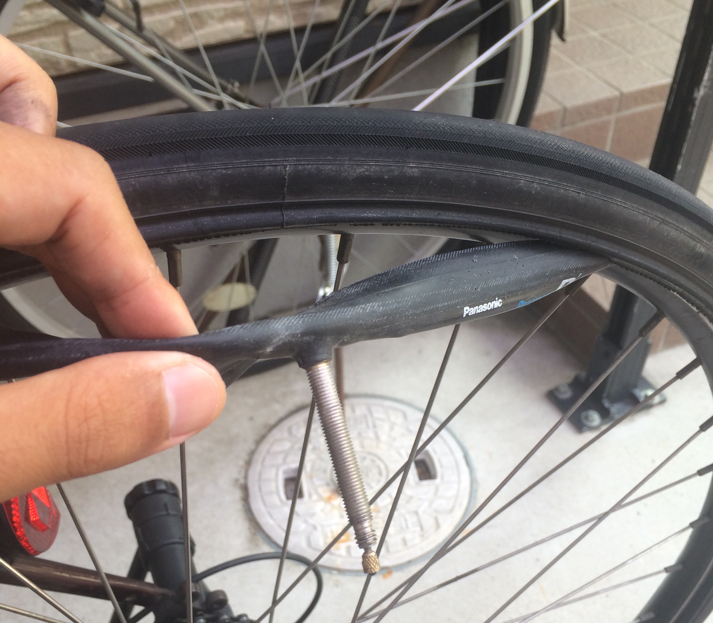ここでチェックをしていないとまたパンクしてしまうのでタイヤの内側を一周全部触ってみる。