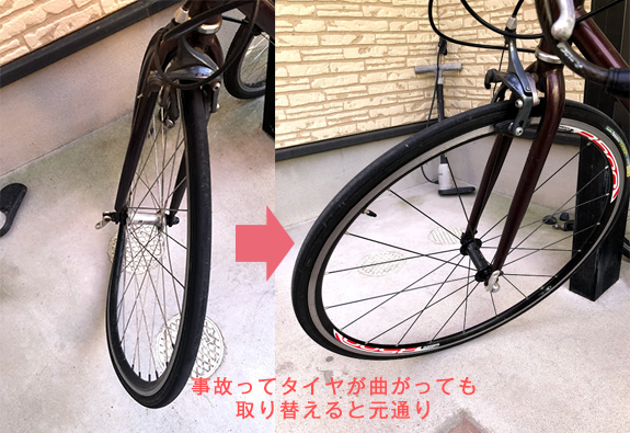 最近事故で前輪が曲がったものの家に余っていたロードレーサーのタイヤをつけたら復活